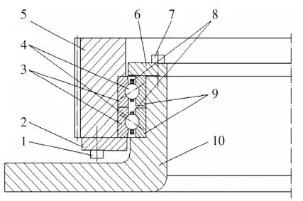 1—外圈壓板螺釘;2—外圈壓板;3—外圈;4—鋼球;5—軸承座;6—內(nèi)圈壓板;7—內(nèi)圈壓板螺釘;8—保持架;9—內(nèi)圈;10—CT機主軸。