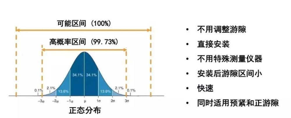 Set-Right使用概率方法并控制相關零件的尺寸公差來確保所有的裝配總成中有99.73%的軸承游隙落在可接受的范圍內。這是一組隨機變量組合后的數學預測,變量就是軸承公差和軸、軸承座等安裝組件的公差。