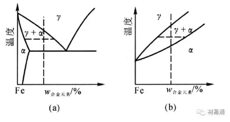 (2)鋼中所含各種元素可分為擴大γ區(qū)元素(如碳、錳、鎳、氮等)和縮小γ區(qū)元素(如磷、銻、錫、硅等)兩大類。圖3表示兩類二元鐵基合金的相圖。