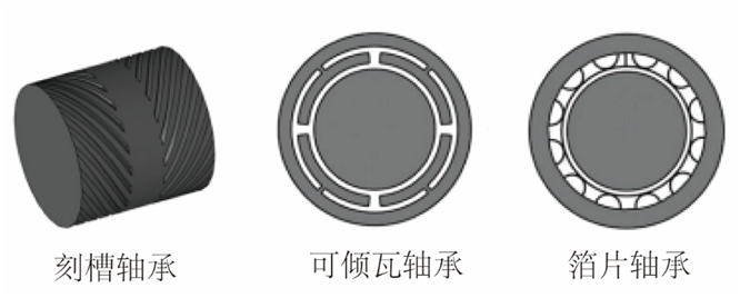 兩相對(duì)運(yùn)動(dòng)表面形成一定收斂間隙,運(yùn)動(dòng)表面的高速移動(dòng)將具有黏滯性的氣體帶入楔形間隙產(chǎn)生壓力升,進(jìn)而產(chǎn)生作用于轉(zhuǎn)子的承載力,承載力的大小隨轉(zhuǎn)速的增加而增加。楔形間隙、潤(rùn)滑氣膜厚度及氣體的黏滯性是形成動(dòng)壓效應(yīng)的關(guān)鍵條件。由于擺脫了對(duì)氣源供氣系統(tǒng)的依賴(lài),使得氣體動(dòng)壓軸承結(jié)構(gòu)簡(jiǎn)單、成本降低。但是,在啟停階段轉(zhuǎn)速較低、動(dòng)壓效應(yīng)較弱時(shí),不足以產(chǎn)生作用于轉(zhuǎn)子的支撐力,導(dǎo)致轉(zhuǎn)子與軸承內(nèi)壁接觸,產(chǎn)生嚴(yán)重的摩擦磨損,直接影響軸承的壽命。此外,氣體動(dòng)壓軸承還存在阻尼特性差,轉(zhuǎn)子過(guò)臨界難的問(wèn)題。針對(duì)以上問(wèn)題,研究者通過(guò)開(kāi)發(fā)耐磨涂層或設(shè)計(jì)不同結(jié)構(gòu)形式的軸承來(lái)解決此問(wèn)題。其中比較有代表性的氣體動(dòng)壓軸承結(jié)構(gòu)形式有刻槽氣體動(dòng)壓軸承、可傾瓦氣體動(dòng)壓軸承、箔片氣體動(dòng)壓軸承,如圖4所示。