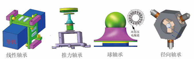 當(dāng)前,對(duì)于擠壓膜氣體軸承的研究主要集中在潤(rùn)滑機(jī)理分析和軸承結(jié)構(gòu)改進(jìn)上。對(duì)于潤(rùn)滑機(jī)理的研究主要從兩種理論進(jìn)行分析,分別是聲輻射理論和流體潤(rùn)滑理論。由于流體潤(rùn)滑理論便于分析轉(zhuǎn)速對(duì)擠壓膜氣體軸承特性的影響,因此,被大多數(shù)研究者采用。對(duì)于擠壓膜氣體軸承結(jié)構(gòu)的改進(jìn)上,研究者分別提出了擠壓膜氣體線(xiàn)性軸承、擠壓膜氣體推力軸承、擠壓膜氣體球軸承、擠壓膜氣體徑向軸承,如圖6所示。